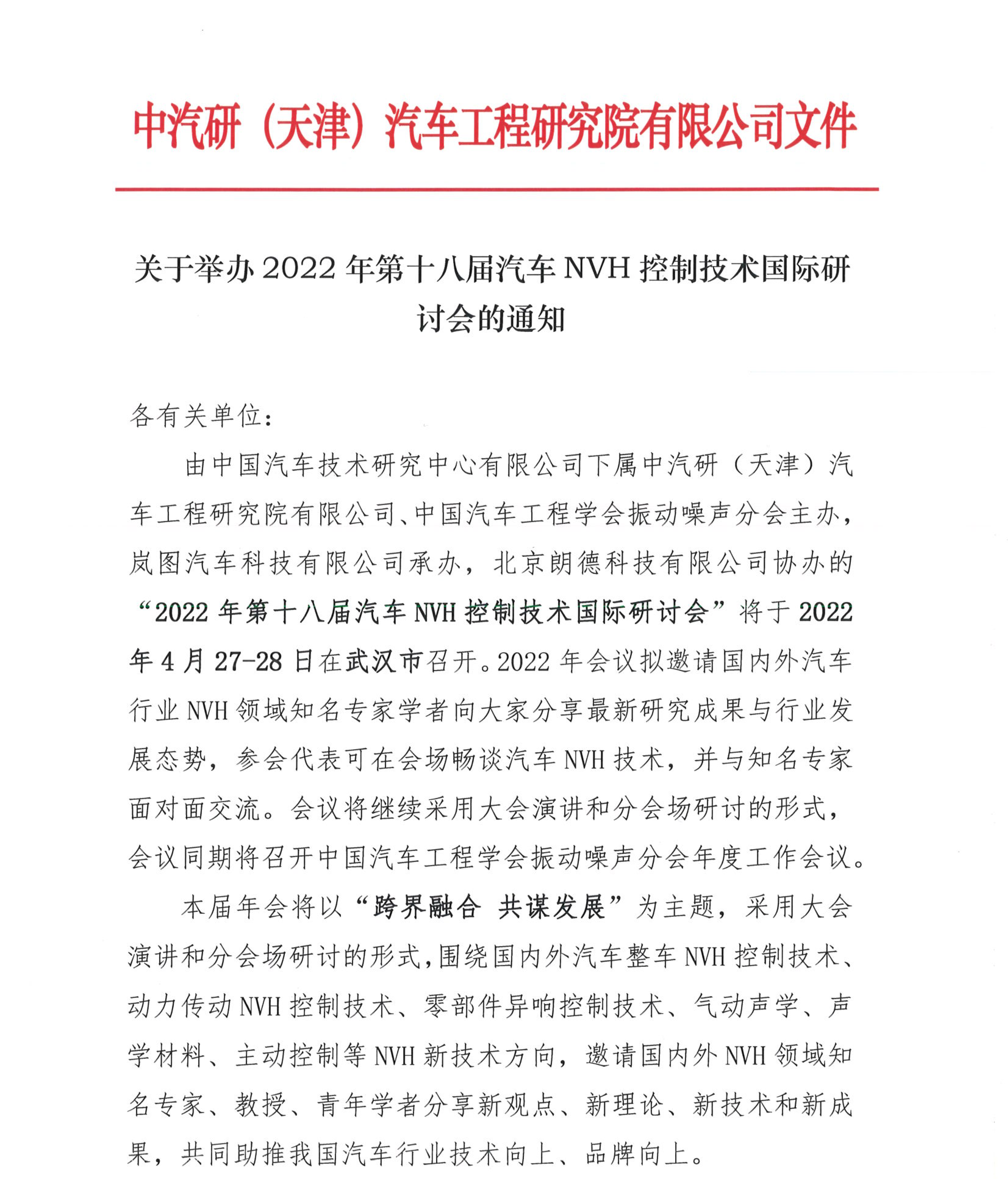 關(guān)于舉辦2022年第十八屆汽車(chē)NVH控制技術(shù)國際研討會(huì )的通知