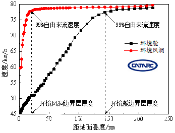 圖2 距風(fēng)洞噴口和環(huán)境艙風(fēng)機出口1m處邊界層厚度對比(目標風(fēng)速80km/h)