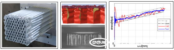 蜂窩鋁結構廣泛應用于汽車(chē)、航空航天與軌道交通等領(lǐng)域。在汽車(chē)行業(yè)中,蜂窩鋁結構多應用于車(chē)輛碰撞壁障設計,通過(guò)改變蜂窩鋁結構設計參數反映車(chē)體不同區域的力學(xué)特性。在整車(chē)前期設計階段,通常采用虛擬仿真的方式進(jìn)行整車(chē)碰撞性能預測。其中,仿真中使用的有限元蜂窩鋁壁障的精度和復雜程度,直接關(guān)系到碰撞仿真結果的準確性和計算效率。為解決蜂窩鋁局部失效與整體變形難模擬的問(wèn)題,工程院安全開(kāi)發(fā)部研發(fā)團隊通過(guò)蜂窩鋁結構的合理CAE等效,材料級、零部件級的靜、動(dòng)態(tài)試驗研究,對蜂窩鋁薄壁力學(xué)性能、撕裂效應等進(jìn)行精準標定,搭建了完善的蜂窩鋁結構仿真開(kāi)發(fā)體系。