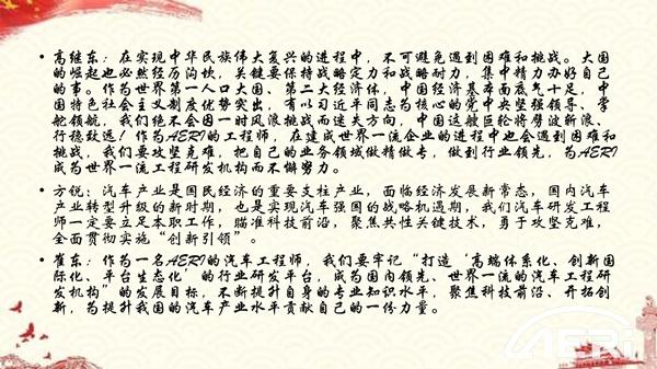 本次學(xué)習卓有成效地統一了全體黨員的思想戰線(xiàn),進(jìn)一步樹(shù)牢 “四個(gè)意識”,堅定“四個(gè)自信”,堅持“兩個(gè)維護”,大大提高了支部的凝聚力與戰斗力。未來(lái),第一開(kāi)發(fā)部黨支部將繼續秉承璦睿人“激情、責任、感恩、奮進(jìn)”的文化理念,堅持“開(kāi)放、變革、創(chuàng )新”的發(fā)展理念,為將工程院打造成國內領(lǐng)先、世界一流的汽車(chē)工程研發(fā)機構而不懈努力,為我國的汽車(chē)工業(yè)貢獻力量?。ㄊ瘔?mèng)妍)