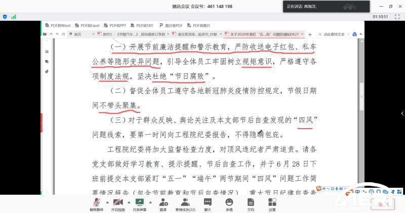 最后,會(huì )議宣貫了工程院紀委下發(fā)的《關(guān)于2020年緊盯“五一”,“端午”兩節期間“四風(fēng)”問(wèn)題的通知》,提醒廣大黨員同志堅決杜絕“節日腐敗”,認真貫徹落實(shí)黨風(fēng)廉政建設和反腐工作要求,構建“三不”一體推進(jìn)體質(zhì)機制,推進(jìn)廉潔文化建設。同時(shí)強調,在節日期間要嚴格遵守各地新冠肺炎疫情防控規定,不帶頭聚眾。