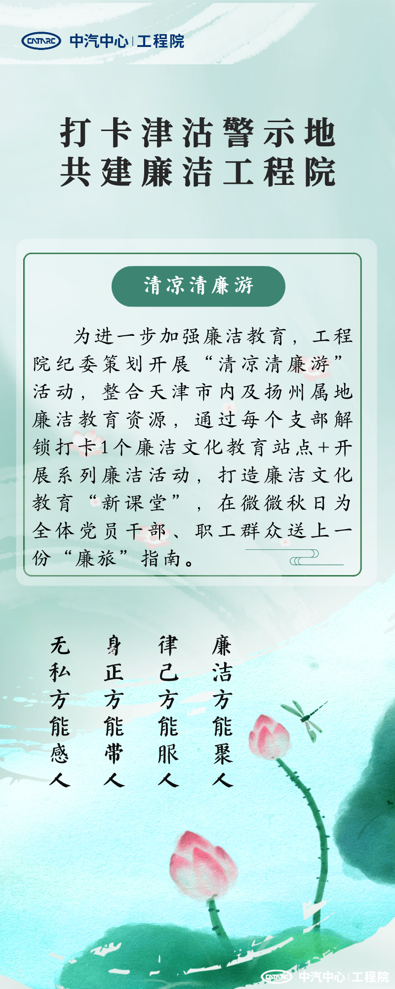- “打卡津沽警示地 共建廉潔工程院”清涼清廉游,打造廉潔文化“新課堂”,加強廉潔文化建設。